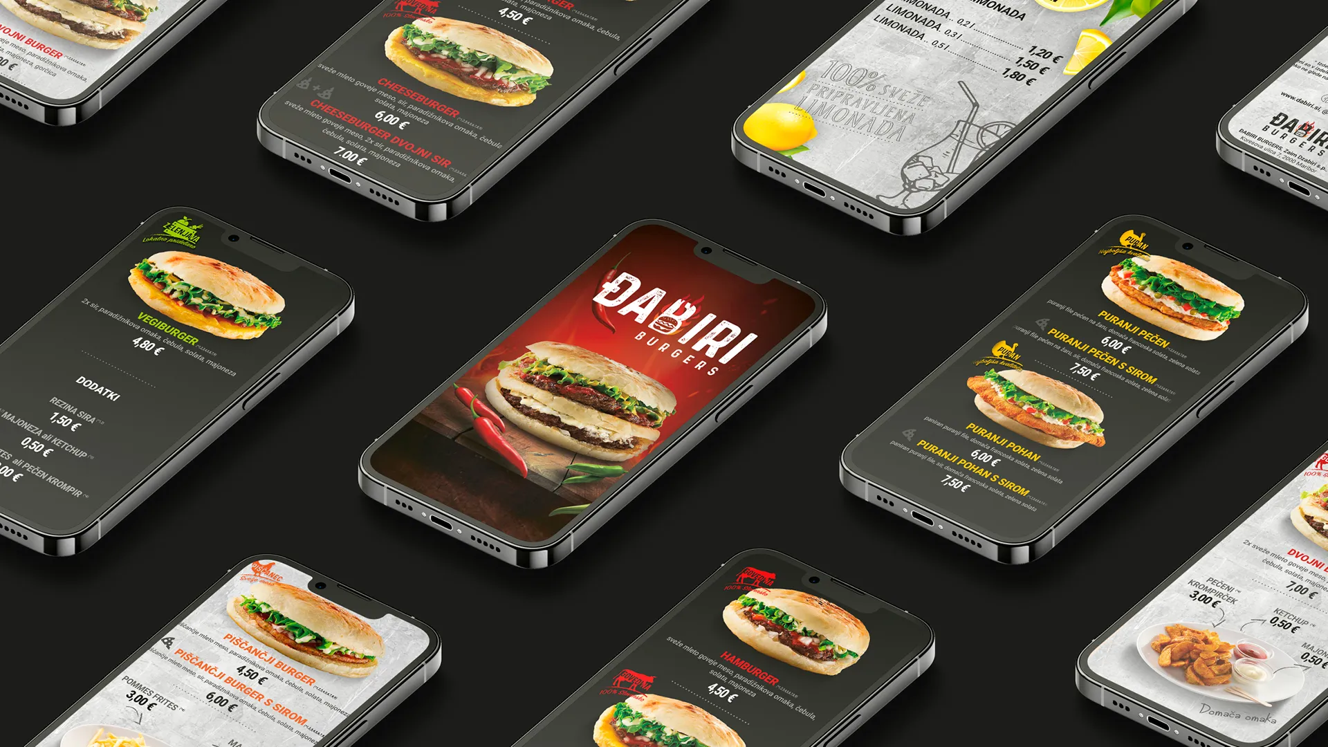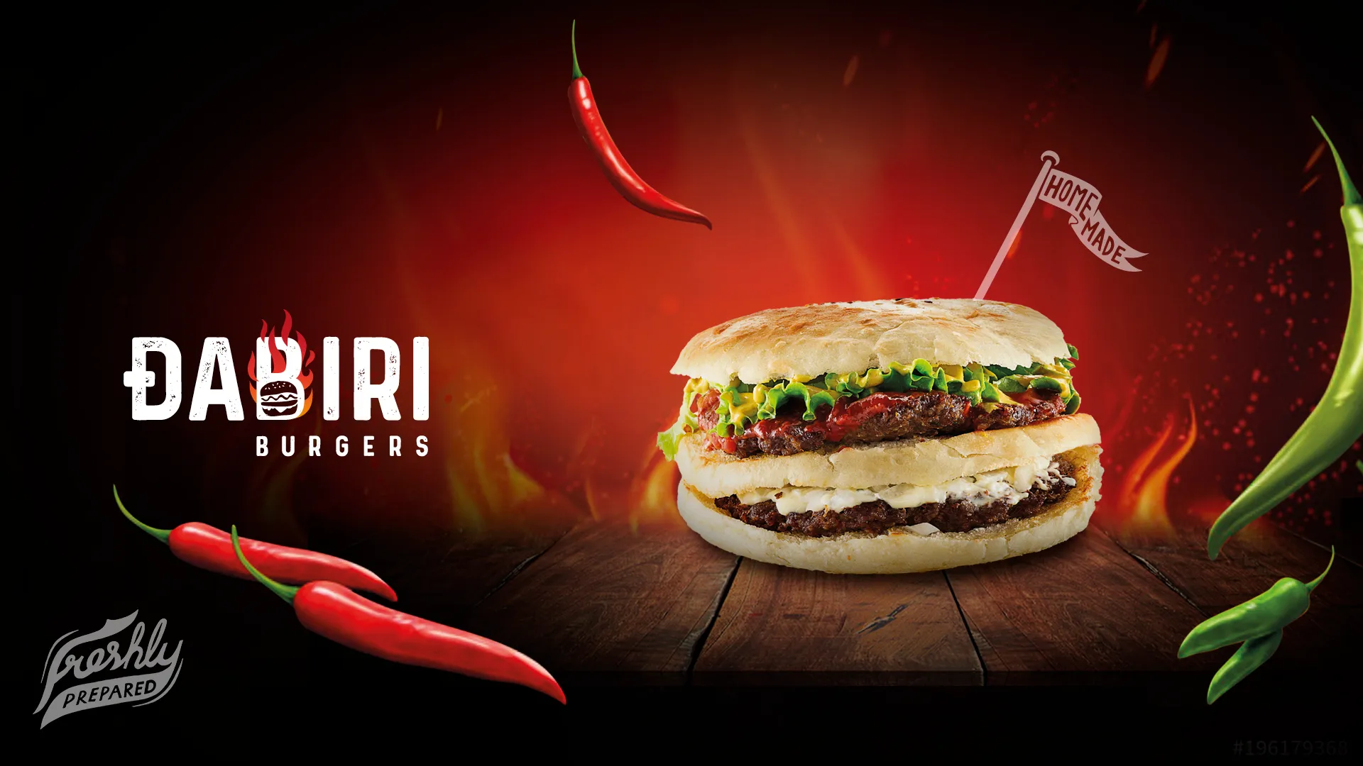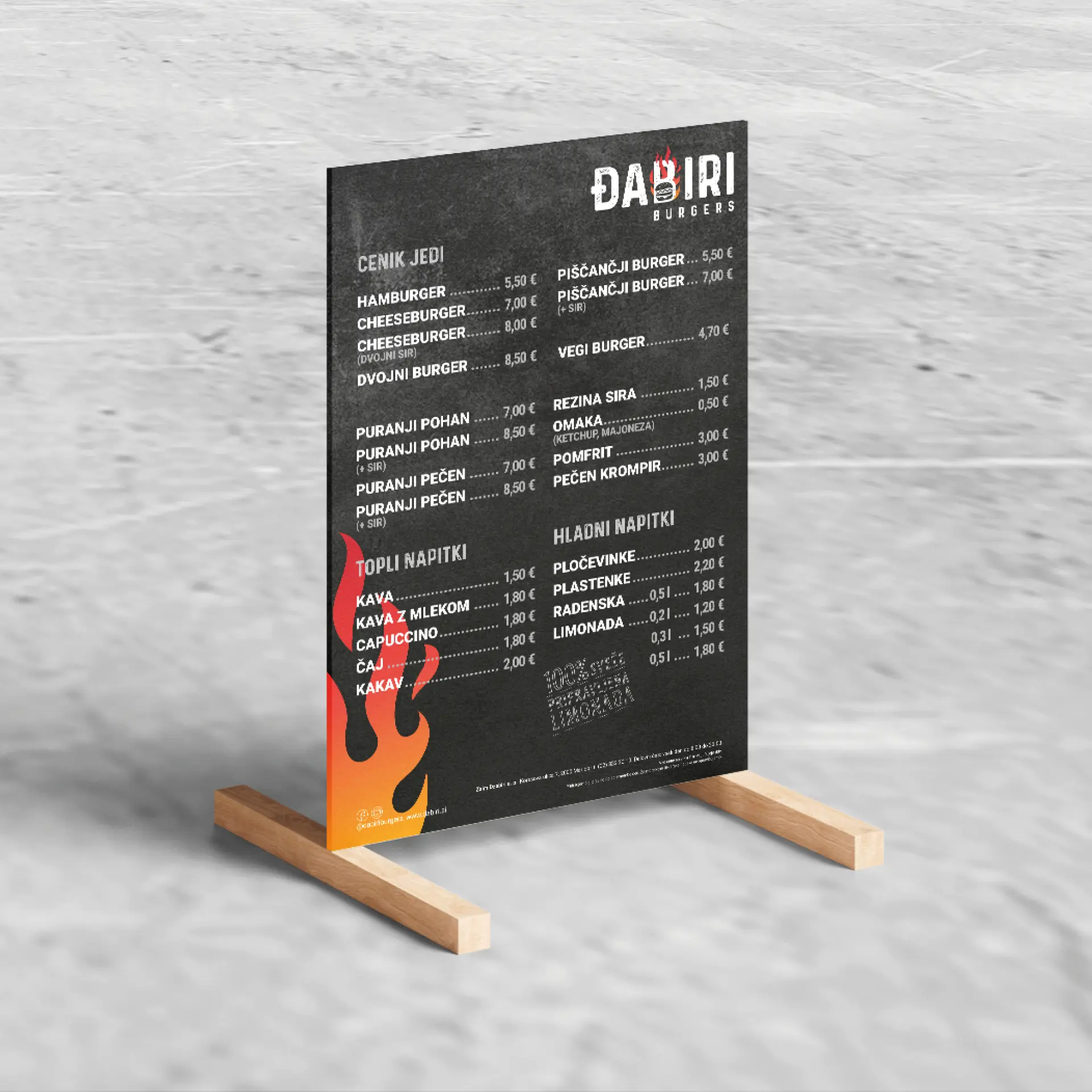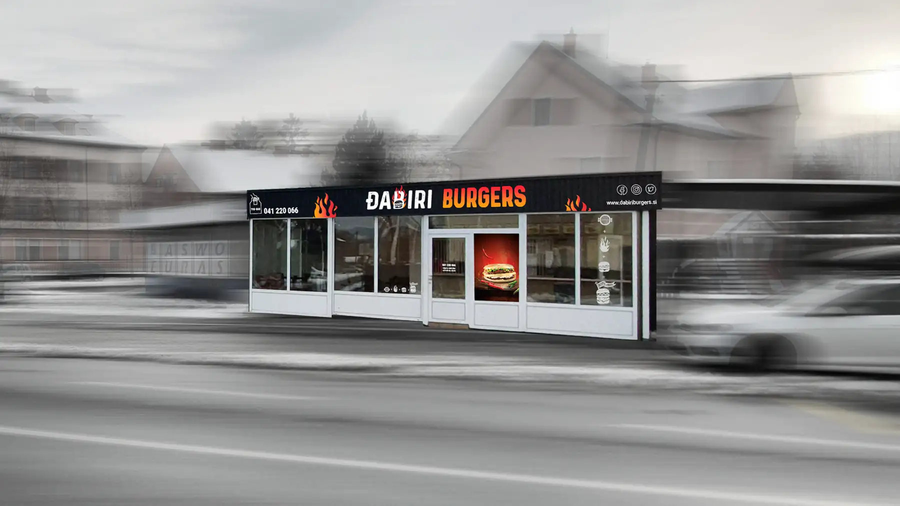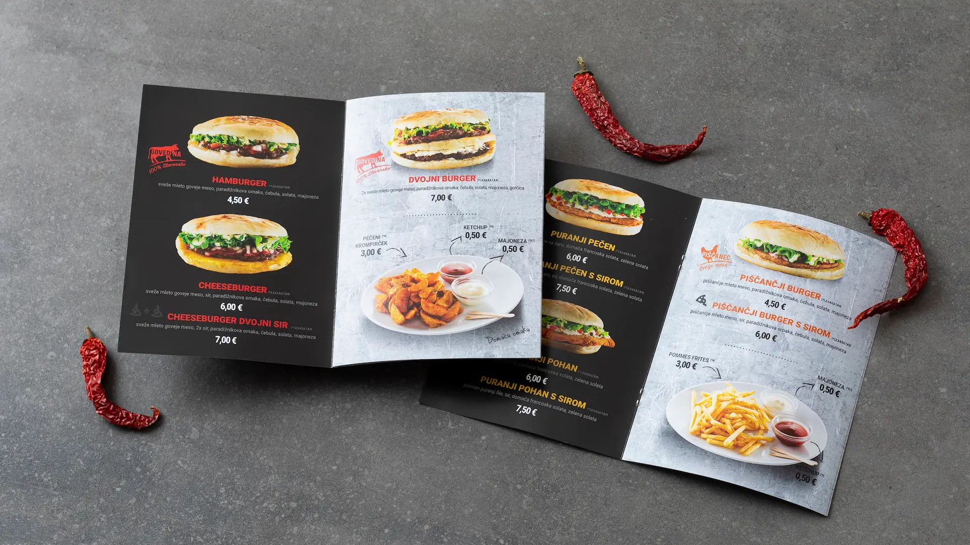 Ustvarila sem prepoznaven logotip, kjer burger in plameni združujejo ključne elemente identitete.